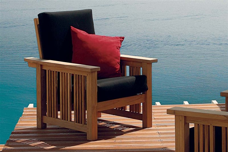 Teaková kolekce Mission značky Barlow Tyrie. Kolekce obsahuje nízké polohovací křeslo, podnožku a konferenční stolek. Konferenční stolek je celoteakový, nízký nábytek kombinuje teakové dřevo a Sunbrellu (venkovní textílii). Lze volit mezi promokavými a nepromokavými polstry a vybírat ze širokého barevného vzorníku.