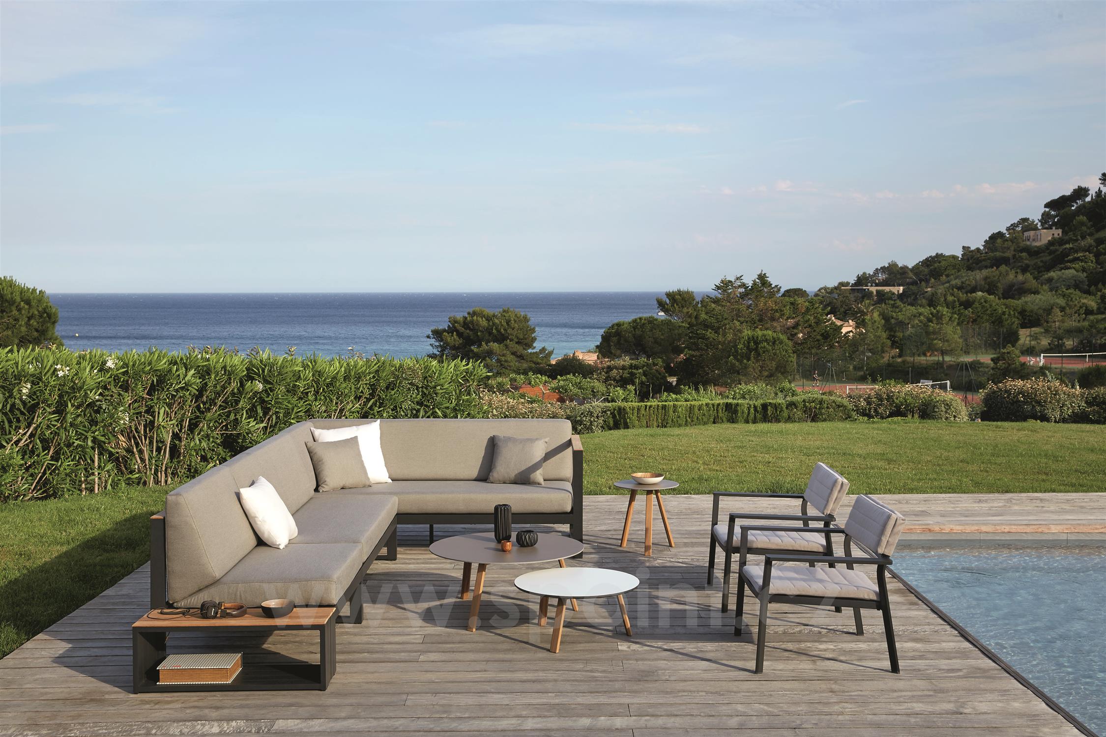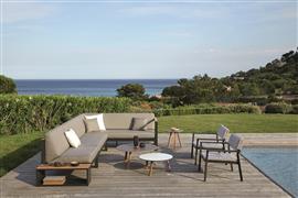 Modulová zahradní sestava s rámy z lakovaného hliníku s teakovými detaily na opěrkách a venkovním polstrováním obsahuje různé díly, které Vám umožní vytvořit sedací sestavu přesně podle Vašich představ a prostorových možností.