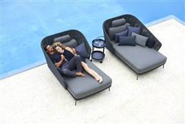 Das Gestell des Relaxmoduls ist aus Metall gefertigt und mit künstlichem Rattan kunstvoll umflochten.