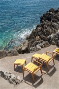 Křesla, podnožka a odkládací stolek z teakového dřeva.