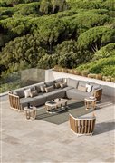 Kolekce sedacího nábytku Swing s dvojí strukturou: jedna vnější hliníková vrstva, druhá vnitřní vrstva z teakových lamel, jejichž kombinace vytváří vyvážené střídání linií a materiálů.