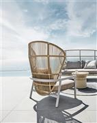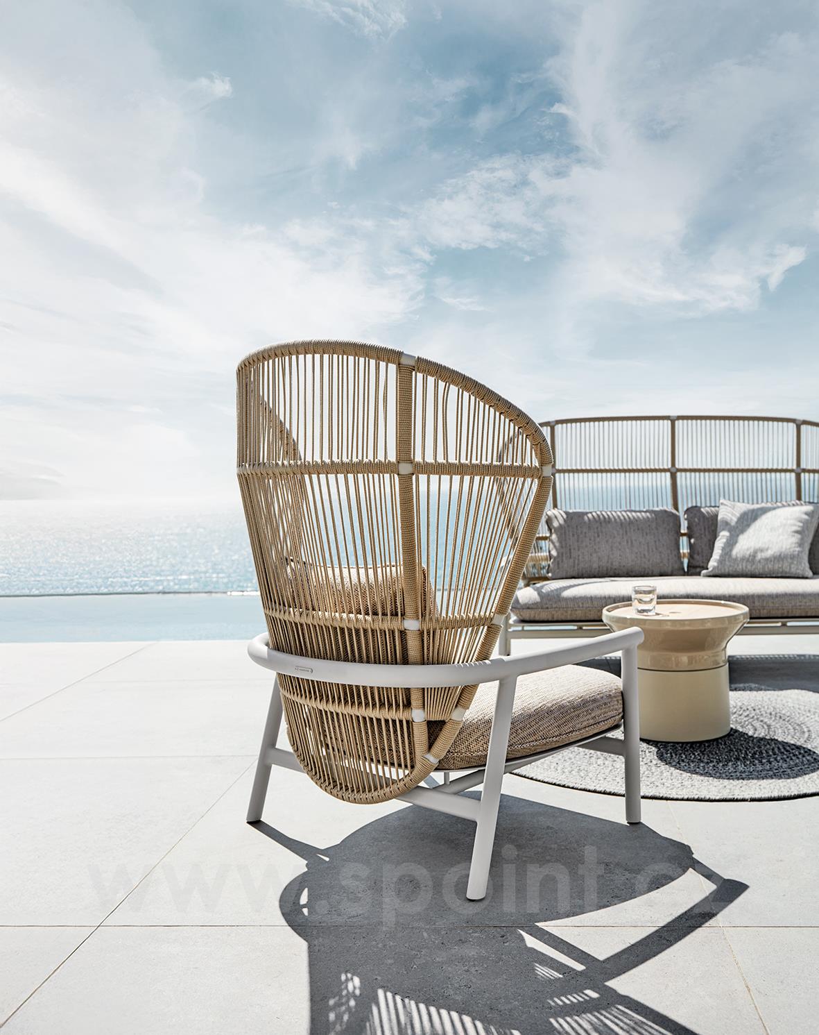 Solitérní designová vzdušná sedací sestava s lankovým výpletem s vysokými nebo nízkými zády.