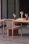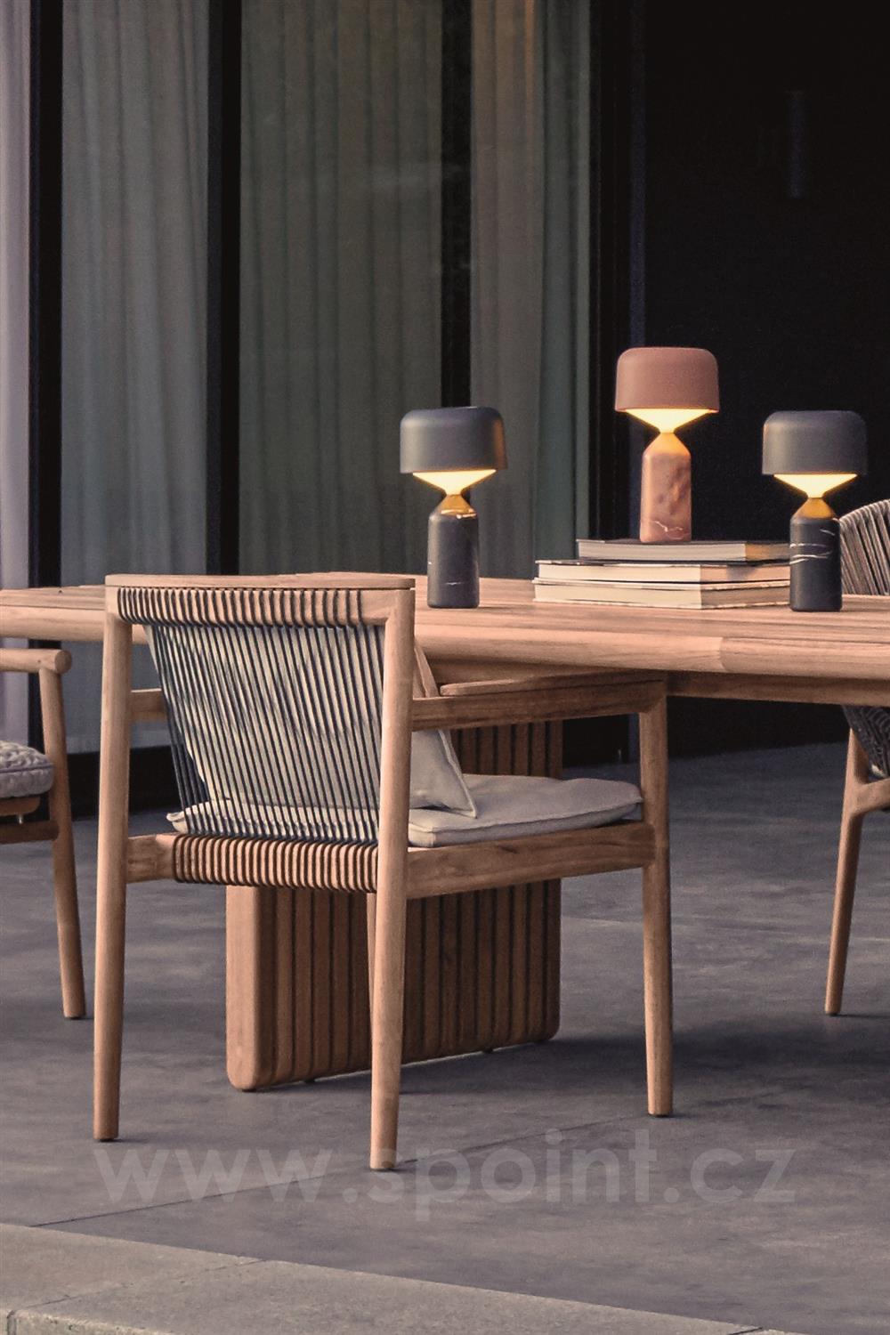 Venkovní nábytek z teakového masivního dřeva Saranac značky Gloster. Kolekce Saranac kombinuje masivní teakové dřevo s lankovým výpletem a polstry z venkovních látek, které jsou velmi odolné, dobře se čistí a rychle schnou. Kolekce Saranac je určena pro celoroční použití.