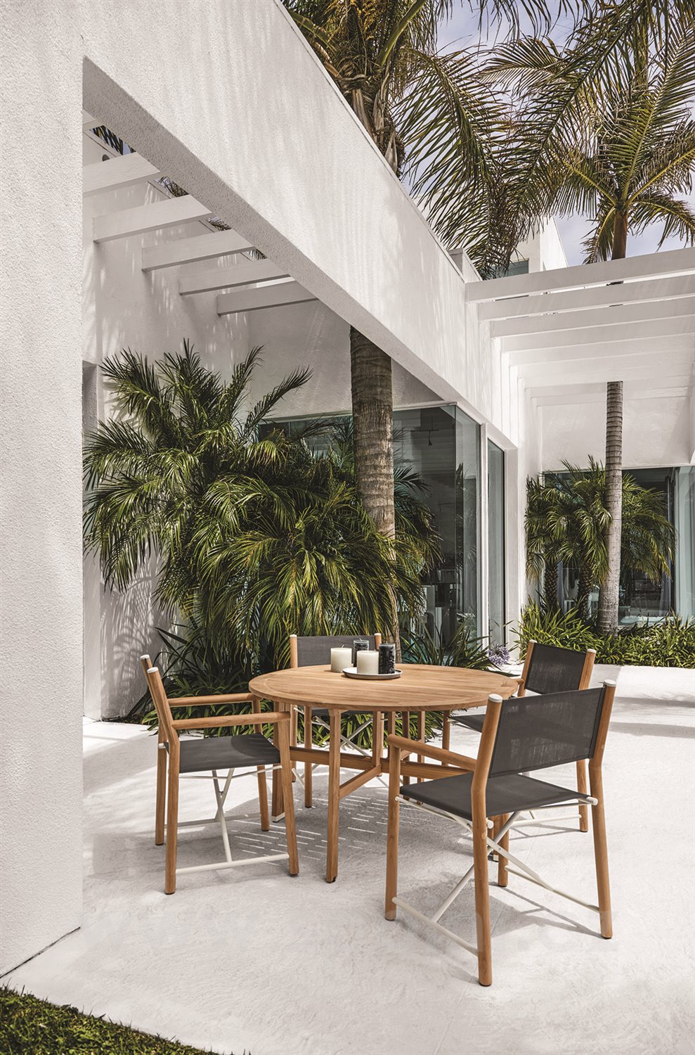 Kolekce praktického skládacího nábytku pro vaši terasu. Skládací kulatý jídelní stůl a venkovní jídelní křesla z teaku s výpletem a polstrováním.