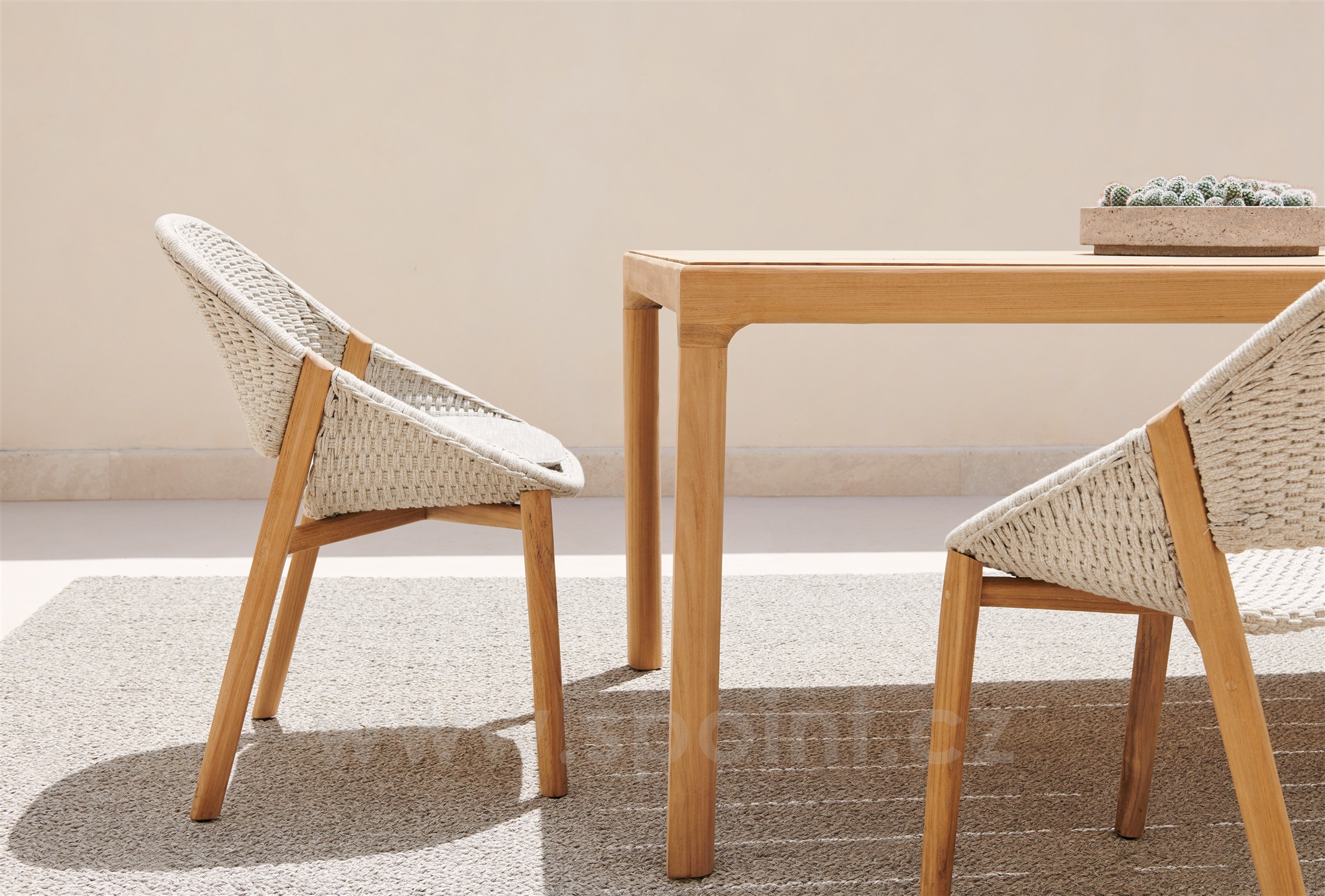 Elegantní teakový jídelní venkovní stůl Illum značky Tribu, rám je z teakového dřeva, deska z keramiky (barva LINEN). Rozměr: 267x100x76 cm.