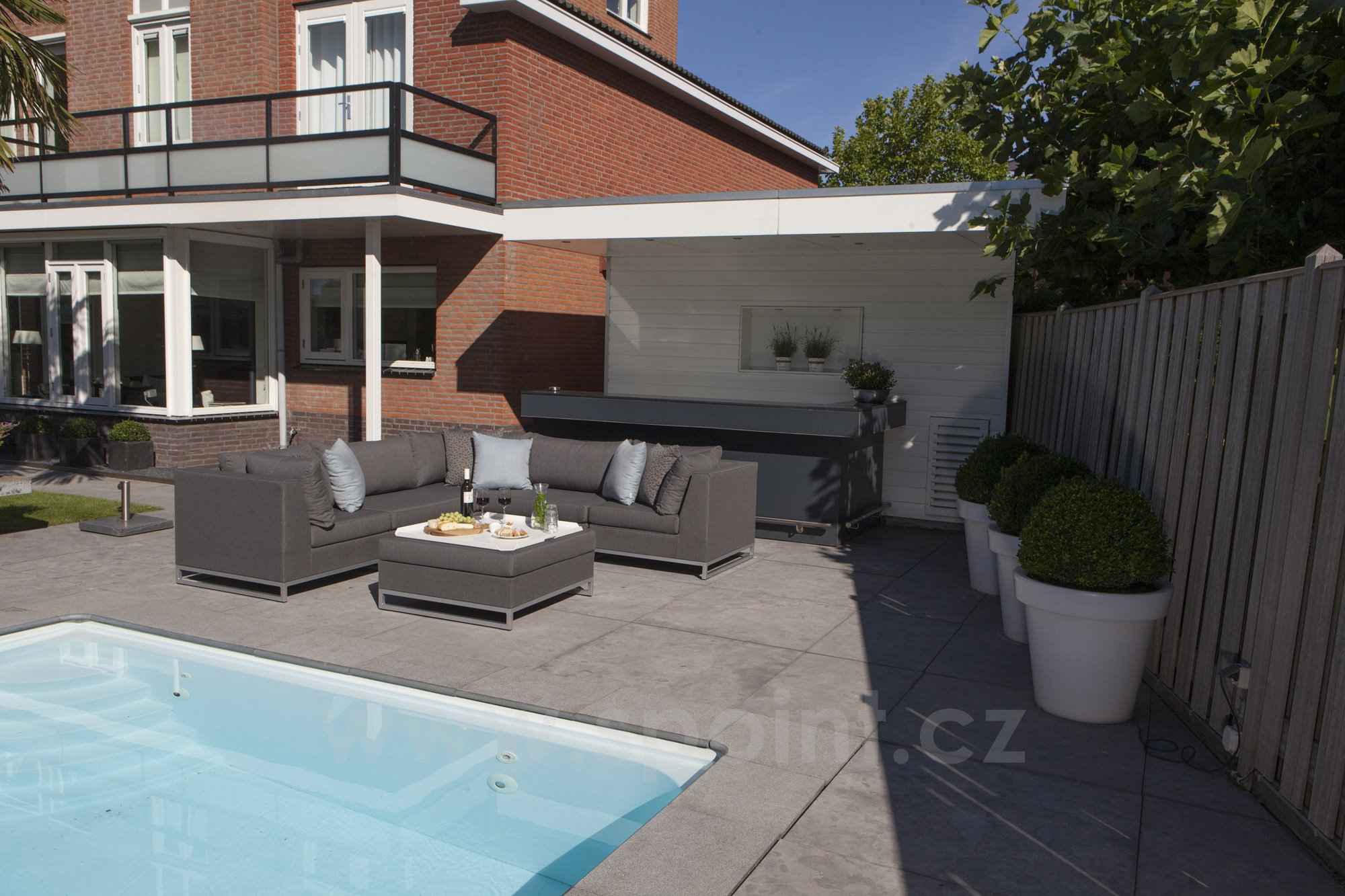Podnožka k modulové sedací sestavě Rhodos značky Persoon. Jednotlivé díly mají hliníkovou konstrukci, potah z venkovní látky Nanotex (velmi odolná látka proti povětrnostním vlivům, UV rezistentní, světlostálá, snadno se udržuje a čistí), výplň sedáků je z rychleschnoucí pěny Dry foam.