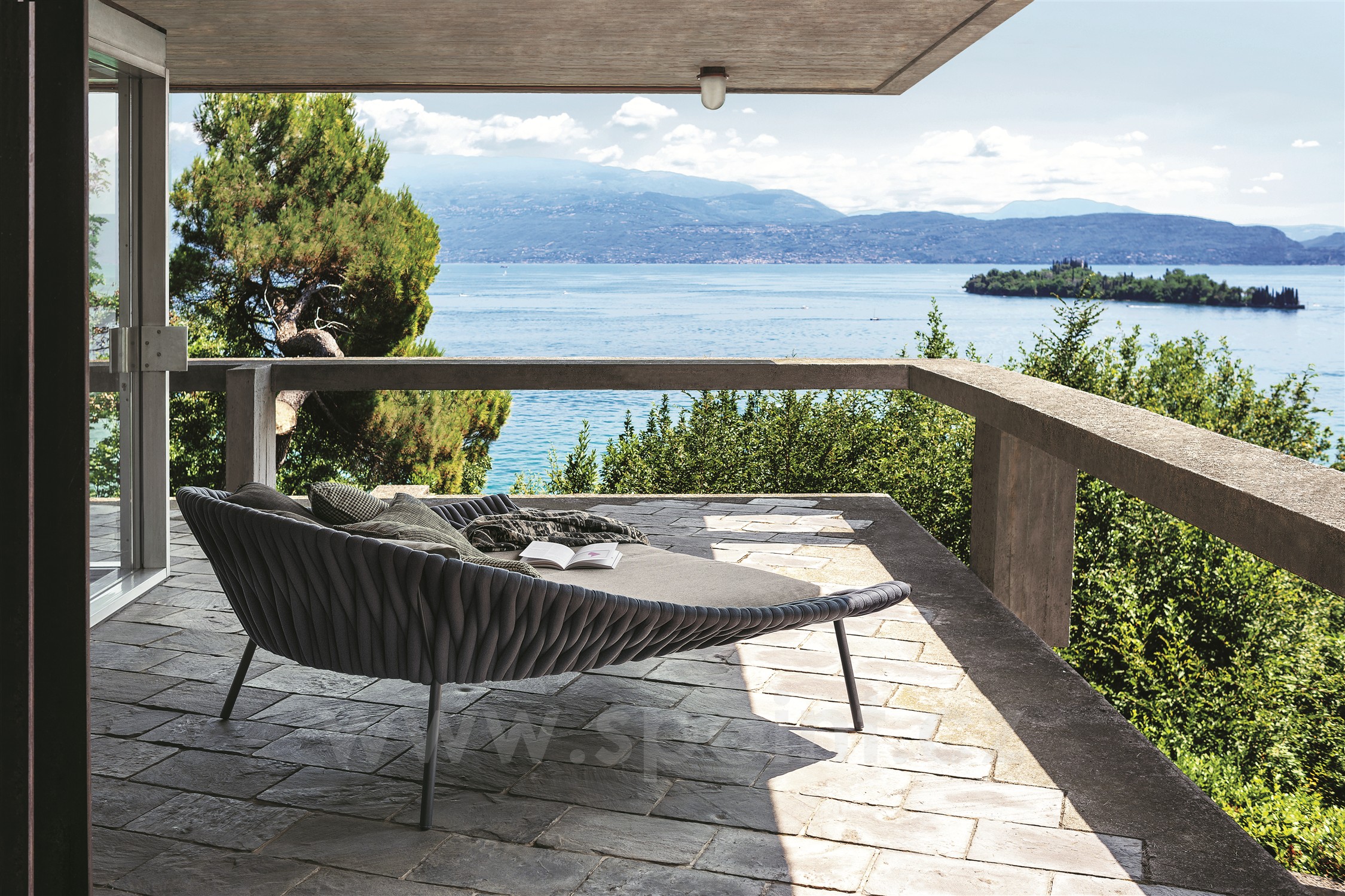 Designová kolekce venkovního nábytku Arena značky Roda má rám z lakovaného nerezové oceli a pásového výpletu.