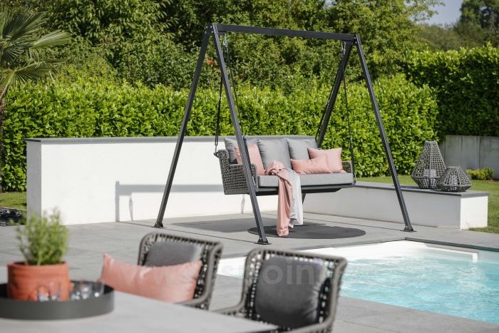 Relaxační nábytek včetně denní venkovní postele z lankového výpletu.