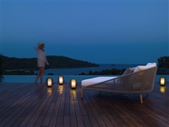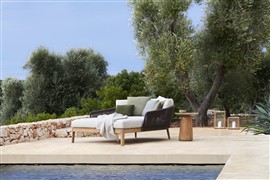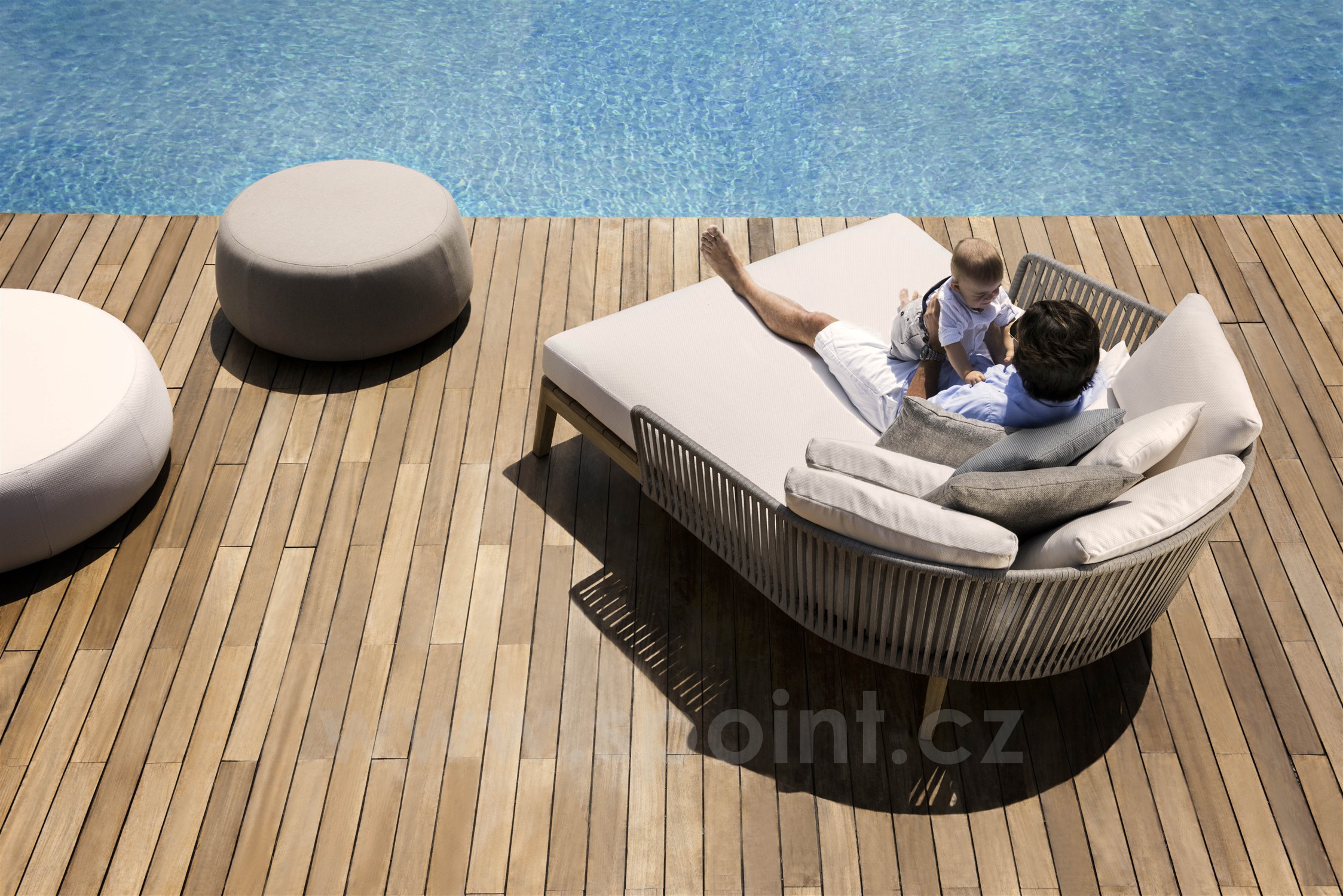 Venkovní postele Mood značky Tribu. Rám je z teakového dřeva v kombinaci s lankovým výpletem.
