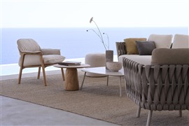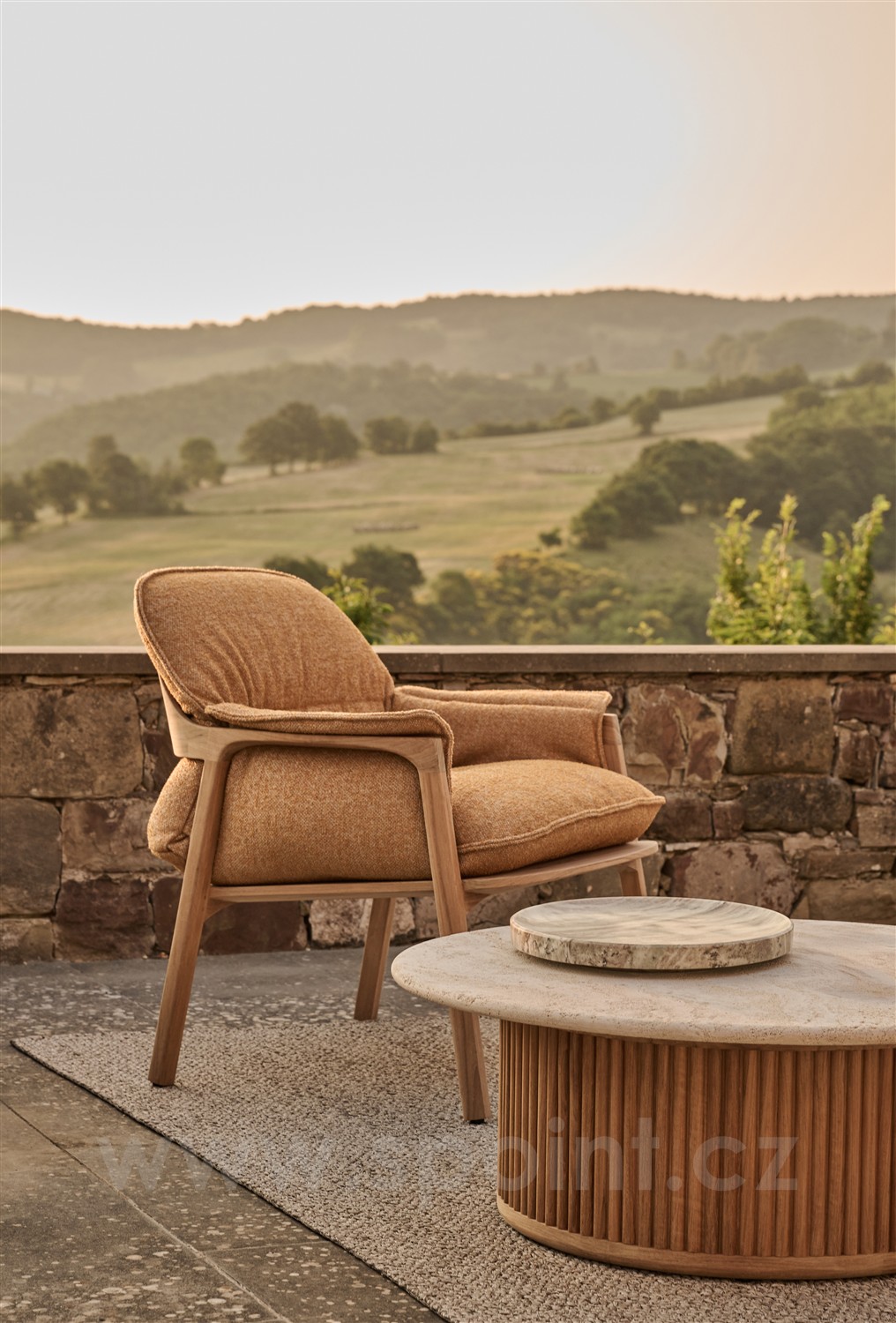 Subtilní a přitom velmi pohodlné nízké venkovní křeslo z teakového dřeva.