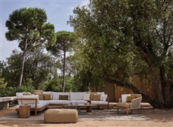 Pohodlná oblíbená luxusní venkovní sedací sestava z teaku značky Tribu.