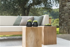 Masivní teakový stolek s přirozenou strukturou.