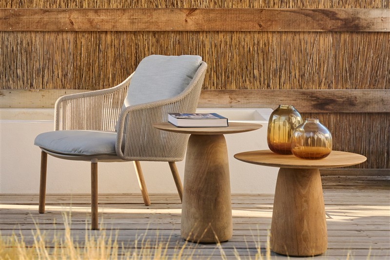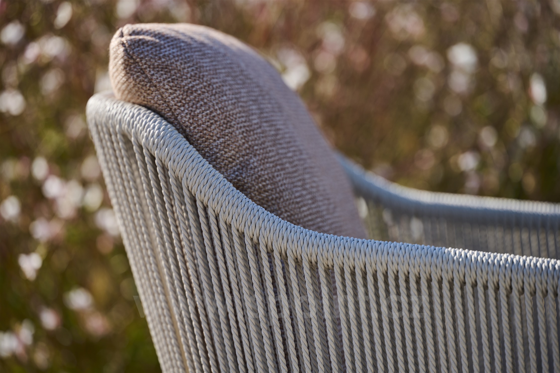 Subtilní a přitom pohodlné nízké venkovní křeslo s lankovým výpletem.