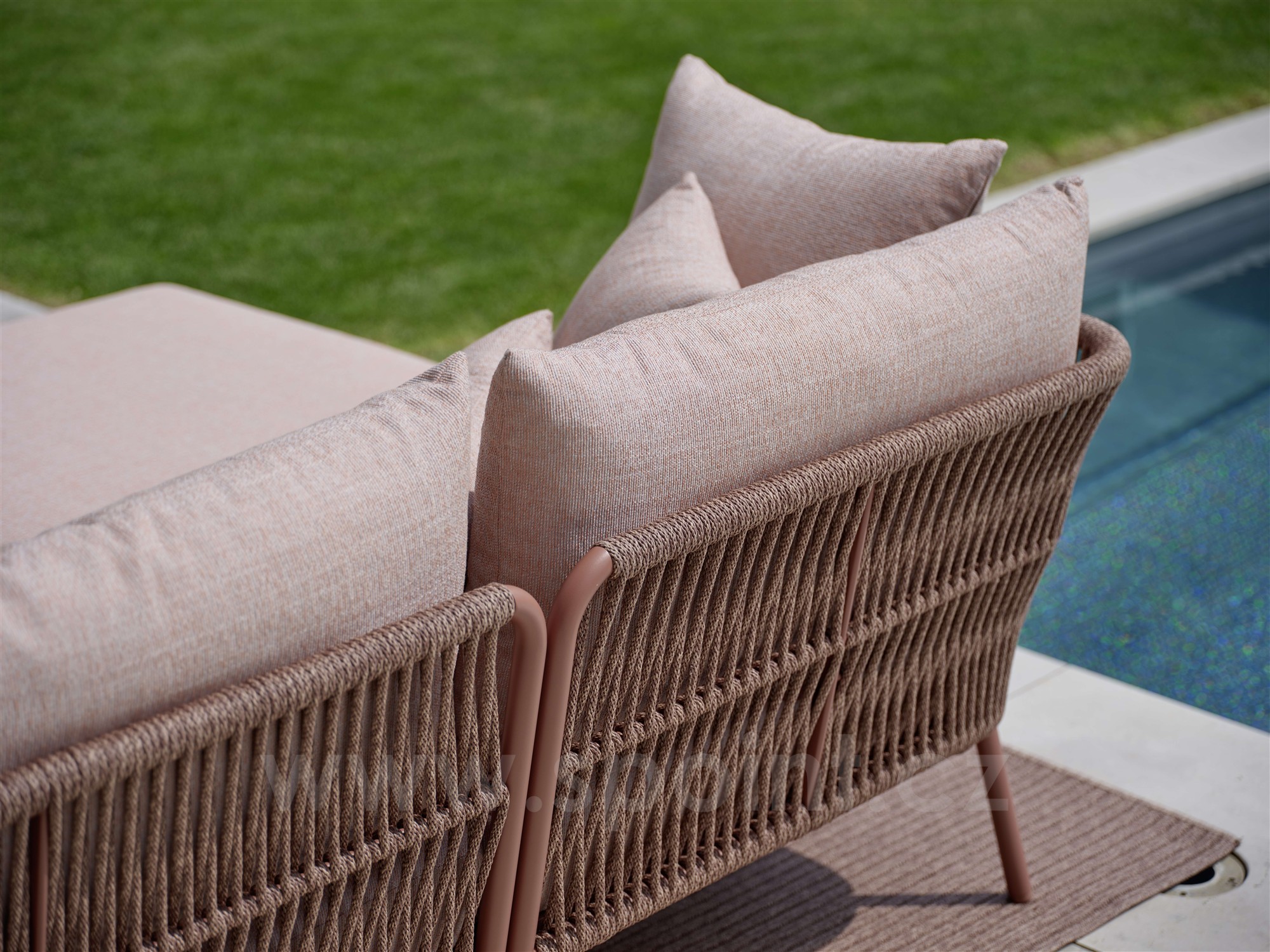 - Sedáky a opěrné polštáře: potah venkovní látka (100% akryl), výplň běžná pěna (nutno je chránit před větším deštěm.) Potahy jsou snímatelné.