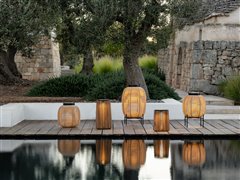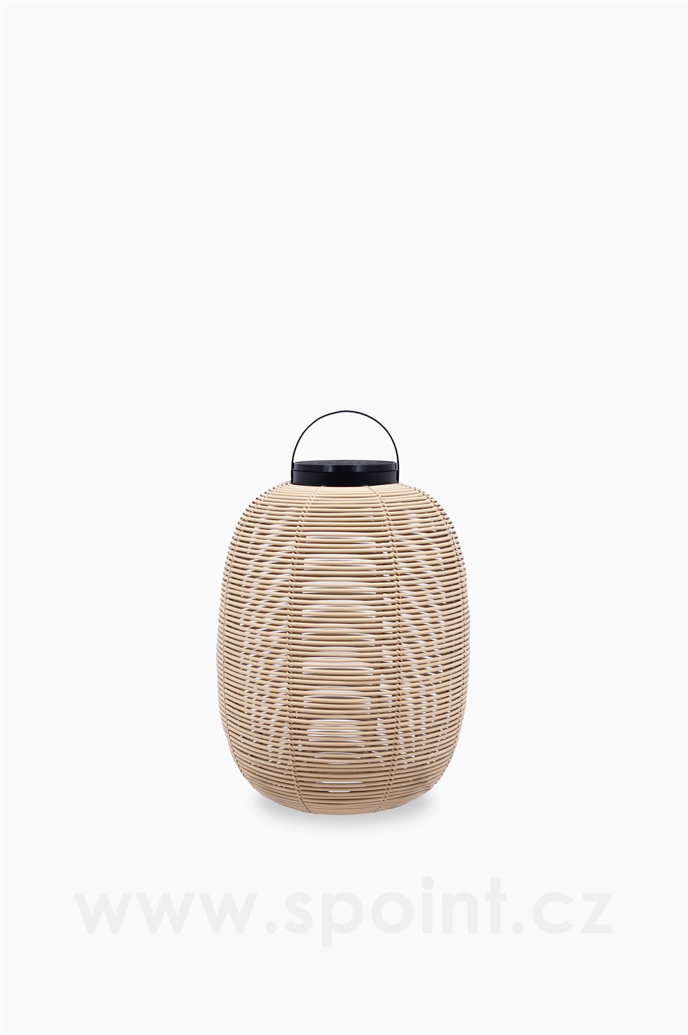 Lucerna má rám z umělého ratanu, madlo lucerny je z lakovaného hliníku.