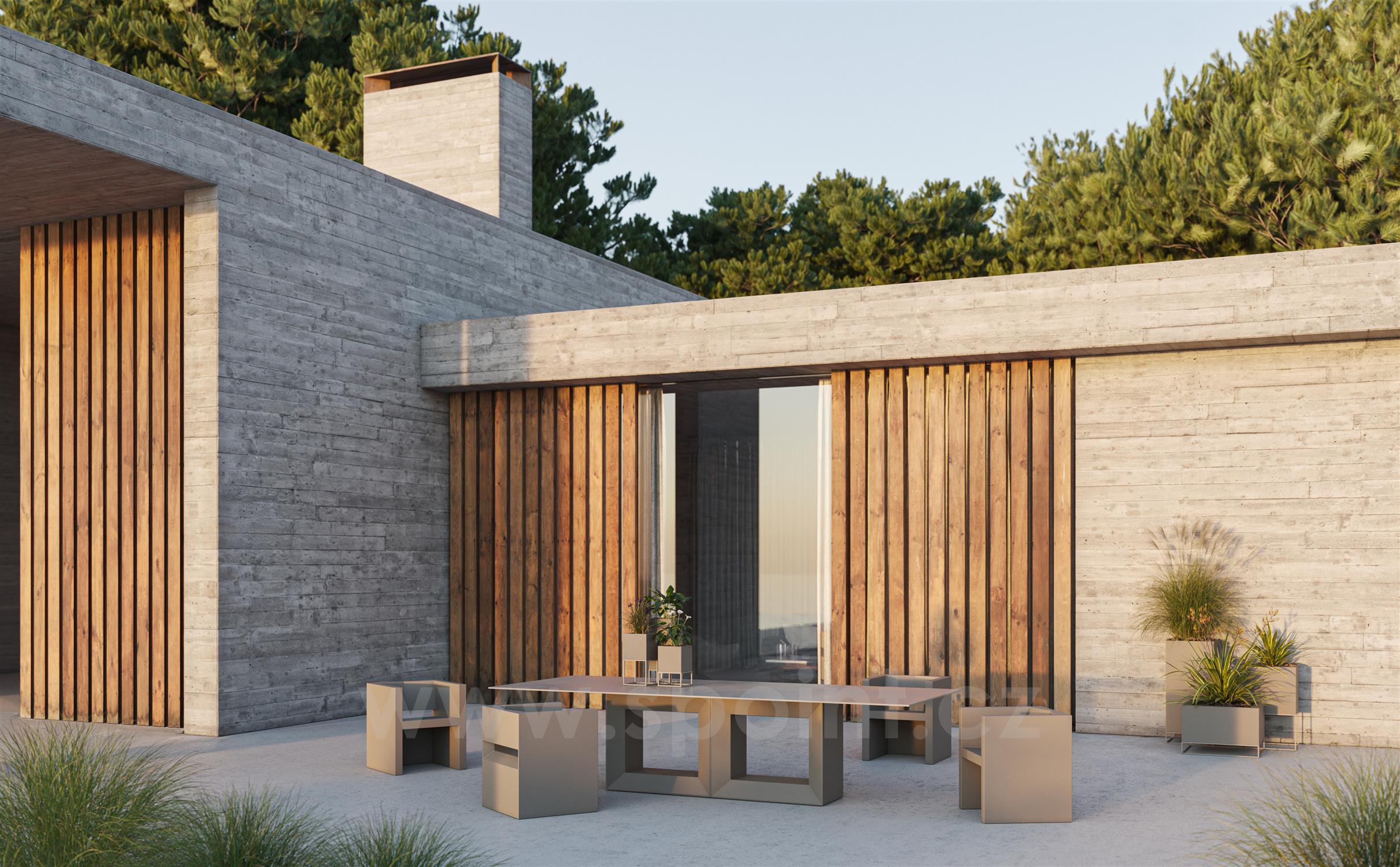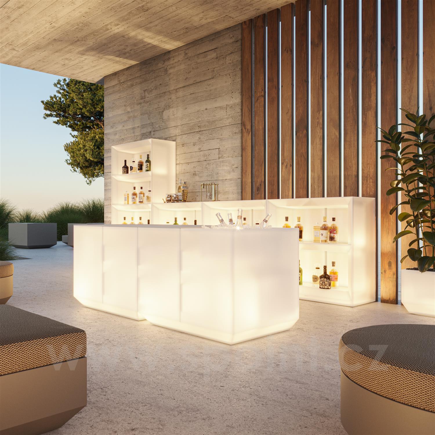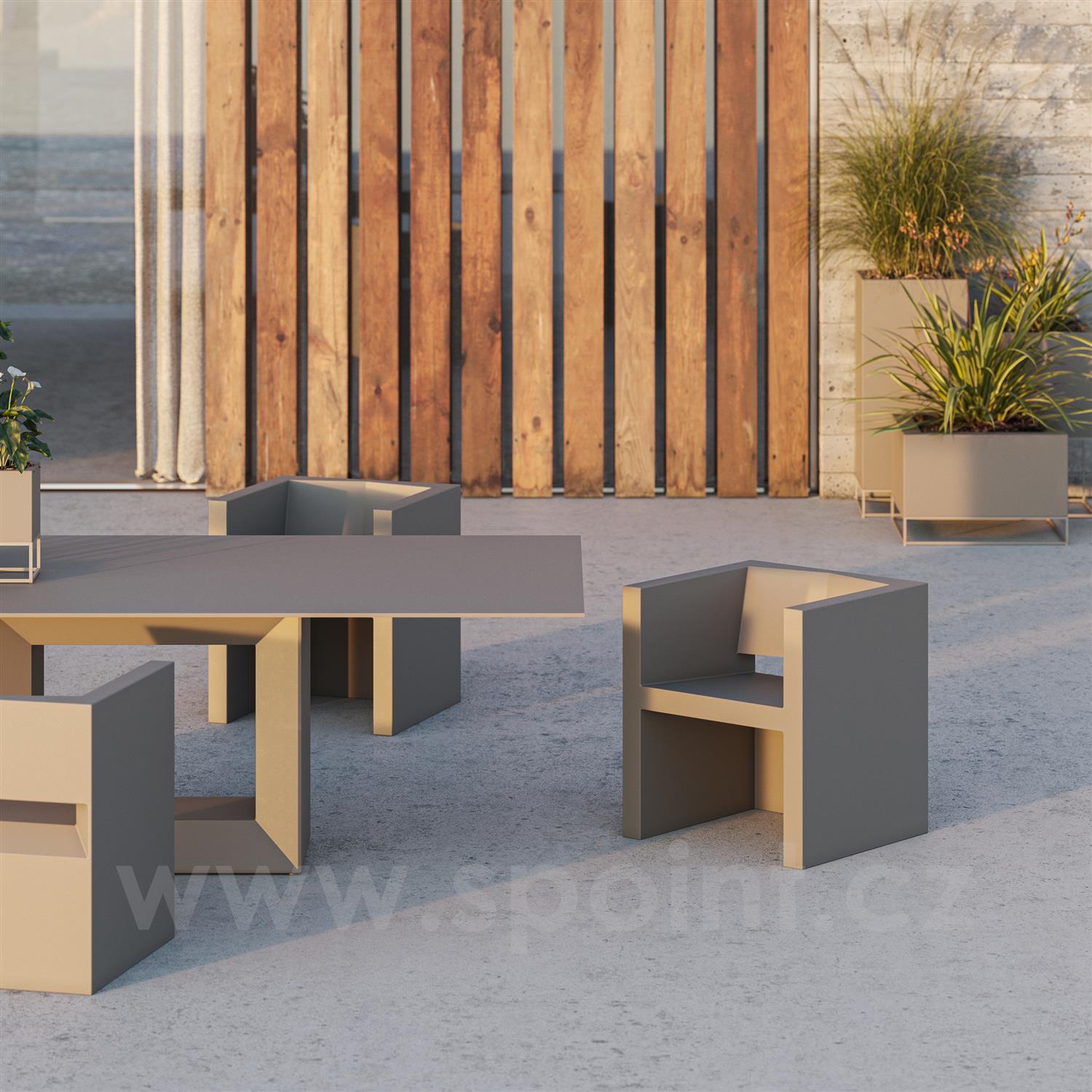 Venkovní jídelní sestava z kolekce Vela od španělské značky Vondom. Kolekce obsahuje také barový pult a policový systém, který je vhodný do hotelů a restaurací.