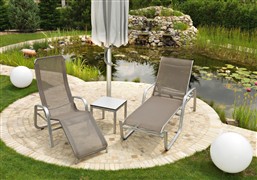 Rám je z lakovaného hliníku, díky tomu je nábytek velmi odolný vůči počasí. Výplet zahradního lehátka ze značkového textilenu (Karatex), který rychle schne, je
