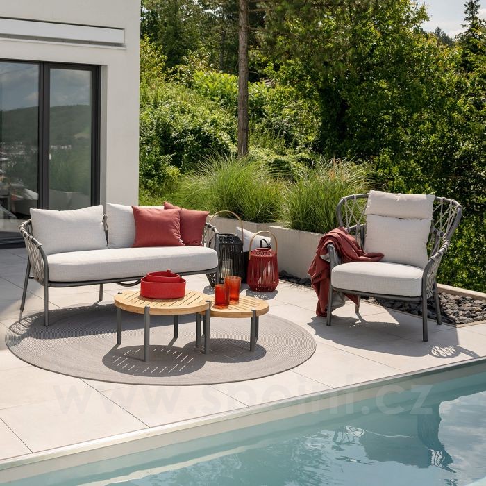Sedák a polštáře jsou z venkovní látky. Výplň sedáků je z běžné pěny a proto je potřeba je chránit před velkým deštěm.