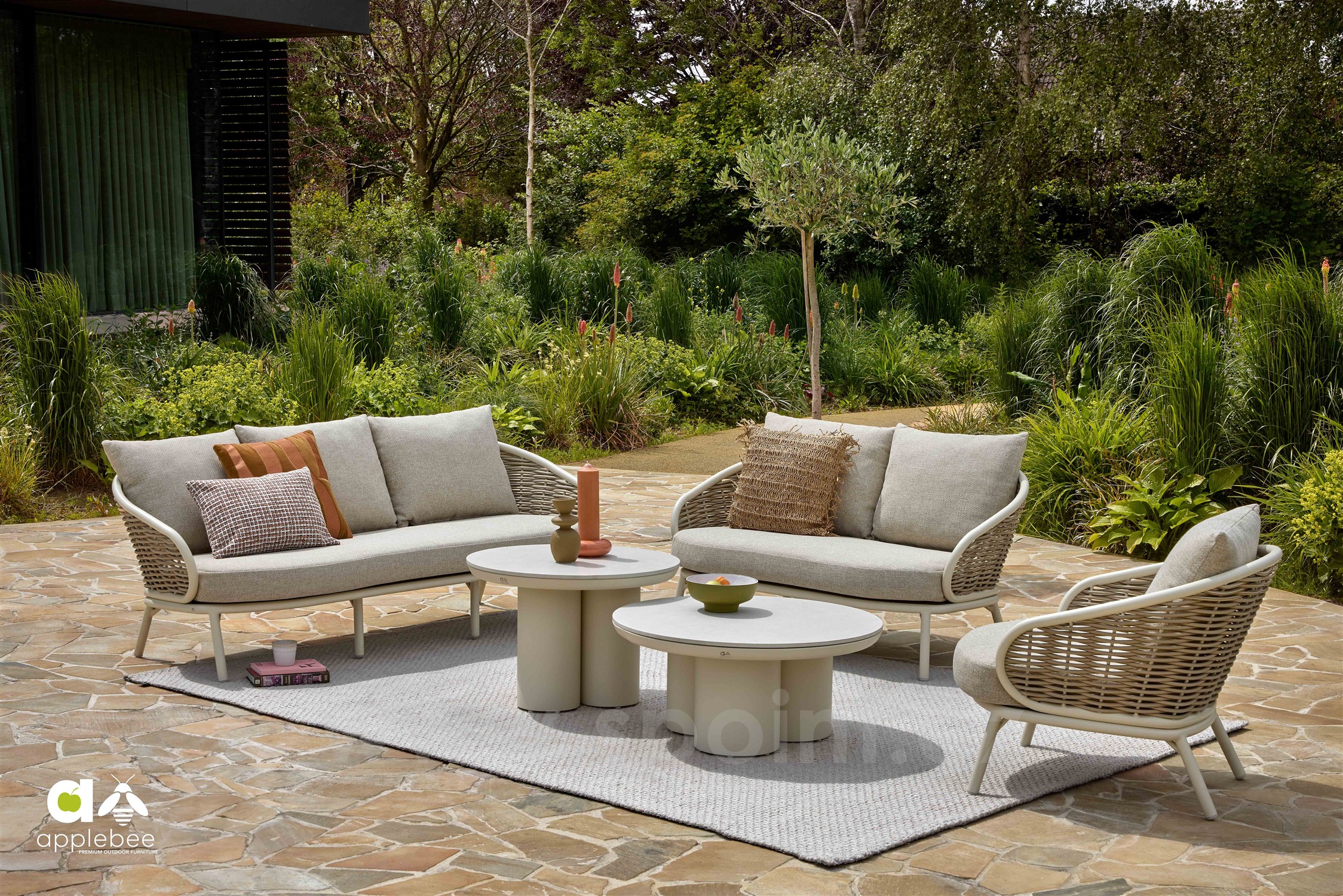 Elegantní 3- místná pohovka Pine Key od Apple Bee s rámem z lakovaného hliníku (barva dle vzorníku) a umělého ratanu, sedáky jsou z venkovní látky (barva dle vzorníku), mají rychleschnoucí výplně a mohou zůstat na dešťi.