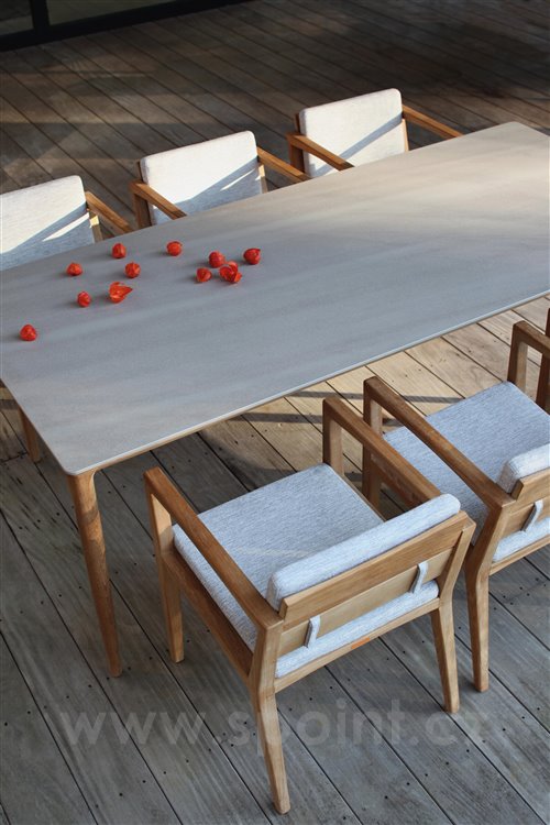 Designový jídelní zahradní stůl U-Nite značky Royal Botania. Konstrukce jídelního stolu je z teakového dřeva. Deska stolu keramika (na dotaz lze i jiné barvy/dekory).