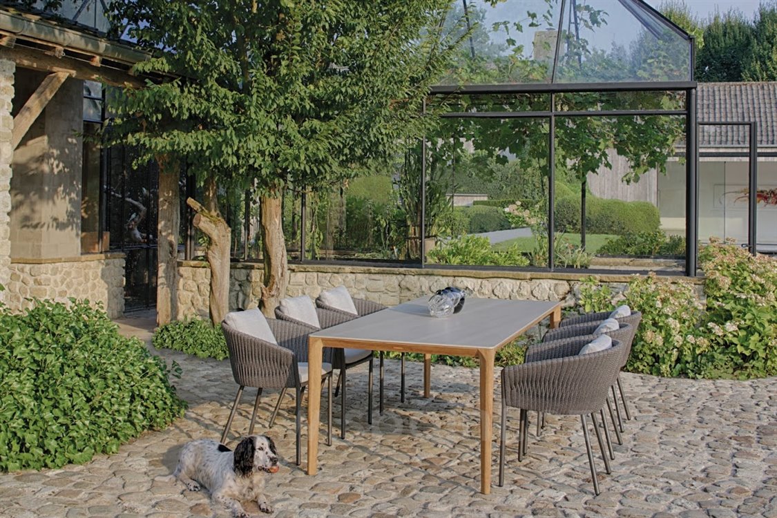 Jídelní zahradní stůl U-Nite značky Royal Botania. Konstrukce jídelního stolu z teakového dřeva. Deska stolu keramika (na dotaz jiné barvy/dekory).