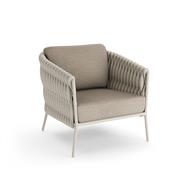 Nízké křeslo Fortuna Socks, Jati Kebon, 77x89x83 cm, rám hliník barva dune mat, výplet barva linen 14 mm, sedáky venkovní látka Sunproof Jalousie Beige